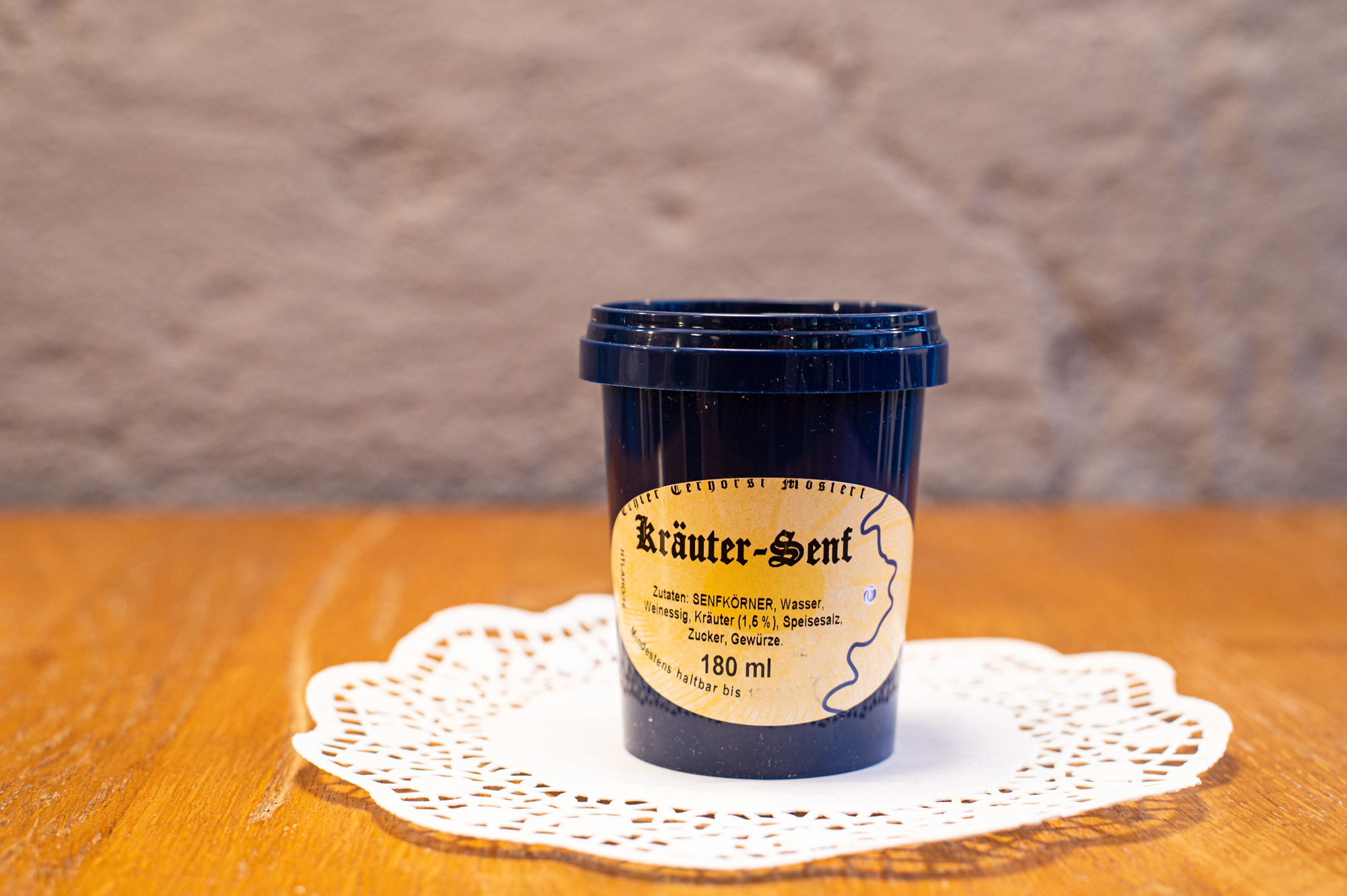 herzhafter Kräutersenf im 180ml-Becher, mit Estragon-Note, ideal zu Wildgerichten, Kalb- und Geflügelfleisch oder als Bestandteil von Salatdressings.